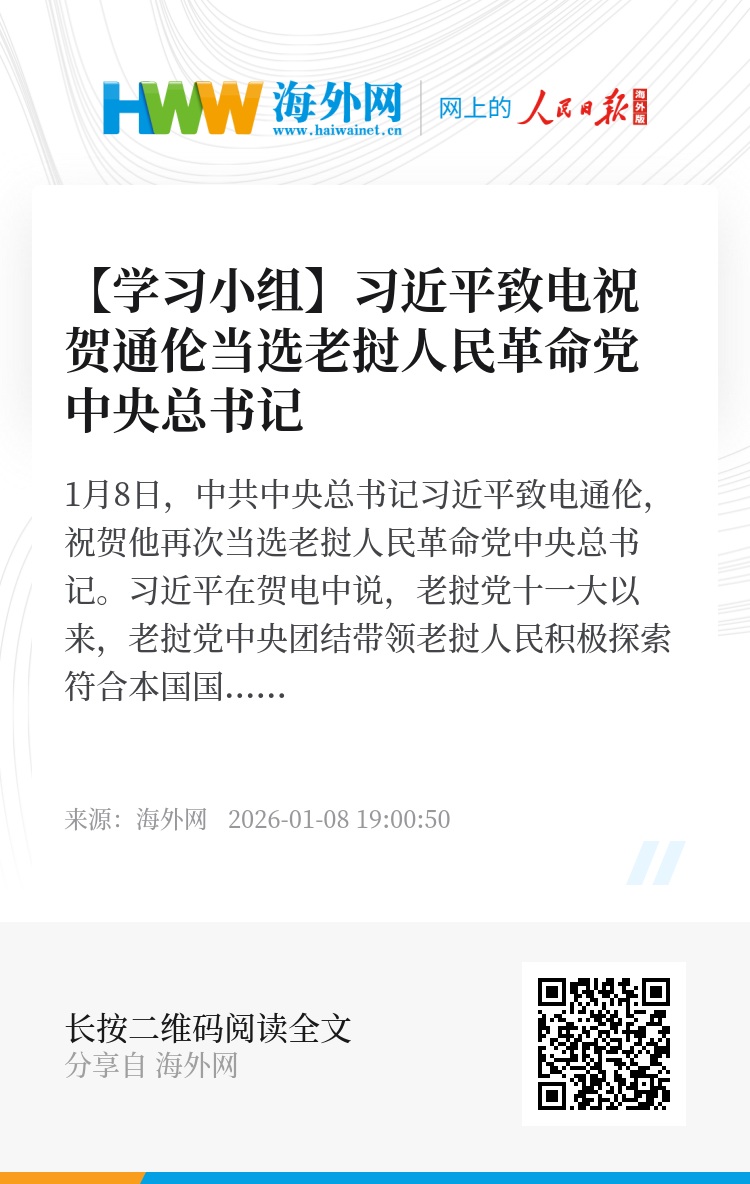 习近平在贺电中说,老挝党十一大以来,老挝党中央团结带领老挝人民积极探索符合本国国情的社会主义发展道路,攻坚克难、砥砺前行,在推进党的建设、发展经济、改善民生、拓展对外交往等方面取得了一系列重要成就。老挝党十二大胜利召开,对于老挝党和老挝社会主义事业发展具有承前启后、继往开来的重要意义。祝愿在以总书记同志为首的老挝党中央坚强领导下,老挝党和人民团结一心、接续奋斗,胜利完成老挝党十二大提出的各项目标任务,不断开创老挝社会主义事业新局面,朝着2055年建党百年奋斗目标勇毅前进。