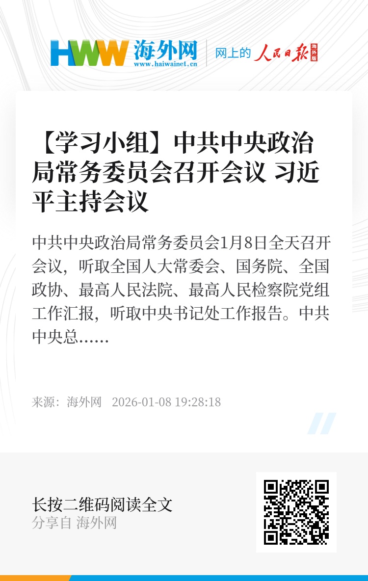 中共中央政治局常务委员会1月8日全天召开会议,听取全国人大常委会、国务院、全国政协、最高人民法院、最高人民检察院党组工作汇报,听取中央书记处工作报告。中共中央总书记习近平主持会议并发表重要讲话。
