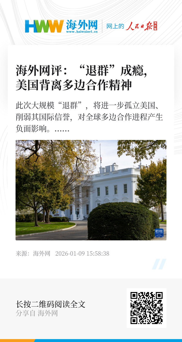 当地时间1月7日,美国白宫发表声明说,美国总统特朗普当天签署总统备忘录,指示美国退出66个“不再符合美国利益”的国际组织。美联社对此评论称,“美国进一步退出全球合作进程”的趋势已愈发明显,美国只向符合自身议程的国际多边机构和项目提供资金支持。此次大规模“退群”,将进一步孤立美国、削弱其国际信誉,对全球多边合作进程产生负面影响。