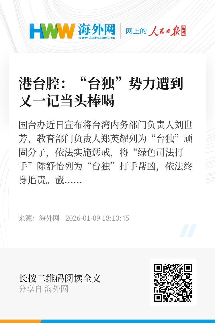 被点名惩治后,3人有的低调不作回应,有的还在大放厥词。台湾陆委会则叫嚣“两岸互不隶属”,妄称大陆对台湾没有“司法管辖权”,甚至倒打一耙,指责大陆的“威胁与恫吓”是“让两岸关系渐行渐远”的原因。赖清德更狂言对各个惩戒对象“感到骄傲”,他进而再度炒作“中国威胁”,呼吁岛内各界支持通过台湾地区防务预算。