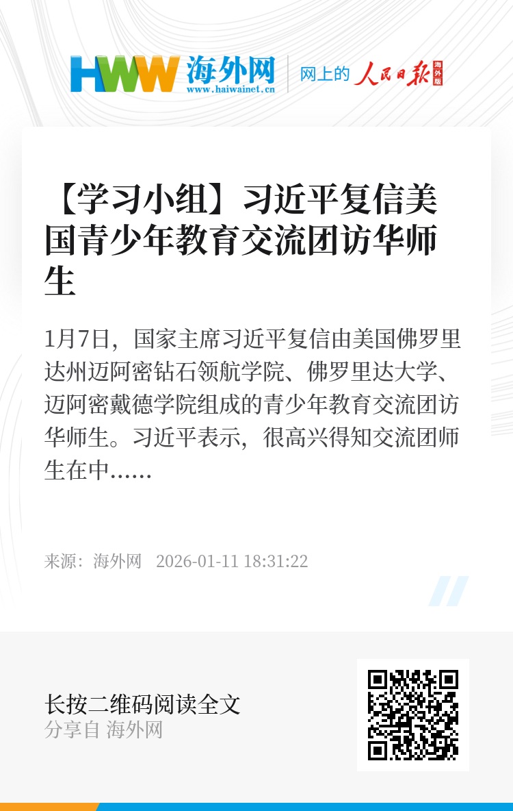 1月7日,国家主席习近平复信由美国佛罗里达州迈阿密钻石领航学院、佛罗里达大学、迈阿密戴德学院组成的青少年教育交流团访华师生。