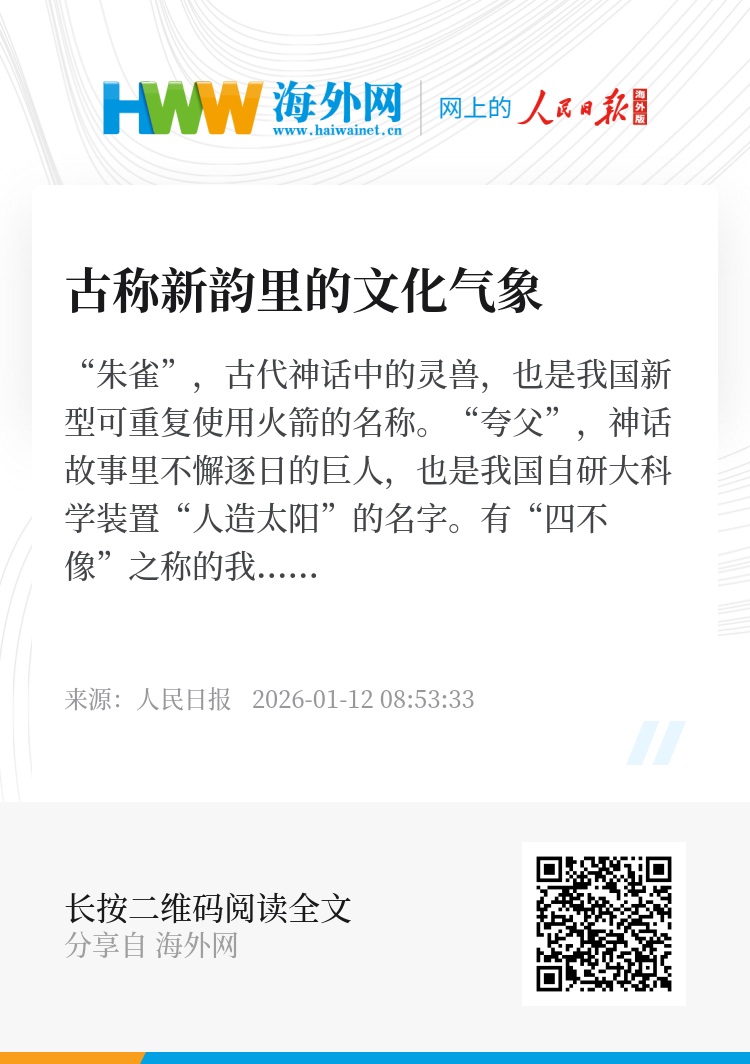 当“中国名”与时代发展同频共振,与人民心声深度契合,每一个听到或看到这些名字的人,都会从中感受到中华文化的生命力与创造力。期待更多生动、可感的文化符号涌现出来,连缀成一座座信心之桥、理解之桥,让可信、可爱、可敬的中国形象更加深入人心。(张鹏瀚)