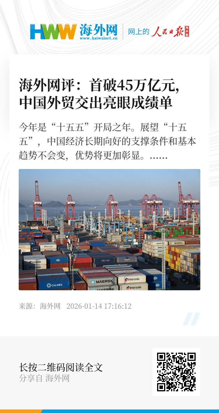 2025年中国外贸取得的成绩,很不平凡、来之不易。回顾2025年,全球经济增速放缓,单边主义、保护主义抬头,国际经贸秩序遭受严重冲击。在此背景下,中国经济顶压前行、向新向优发展,改革开放迈出新步伐,货物贸易实现较快增长,展现出强大的韧性和活力。2025年,中国外贸进出口45.47万亿元,增长3.8%。其中,出口26.99万亿元,增长6.1%;进口18.48万亿元,增长0.5%。在国际市场价格下降的情况下,自去年二季度开始,中国进口连续3个季度保持增长。最新国际数据显示,去年前三季度,中国已成为全球79个国家和地区的主要出口目的地,比2024年全年增加了3个。《华尔街日报》14日评价称,“面对美国高额关税,中国这个世界第二大经济体依然保持韧性。”路透社14日援引经济学家的话称,中国经济仍然极具竞争力,出口总额的增长反映了生产率的提高和中国制造商技术水平的提升。