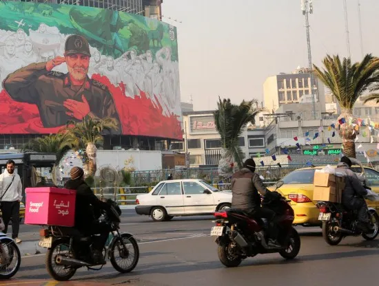 伊朗首都德黑兰街头,车辆经过一幅绘有伊遇袭身亡的高级将领卡西姆·苏莱曼尼形象的宣传海报。图源:新华社