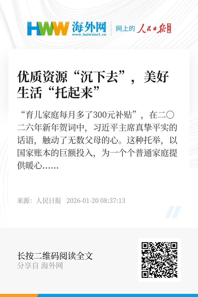 “育儿家庭每月多了300元补贴”,在二〇二六年新年贺词中,习近平主席真挚平实的话语,触动了无数父母的心。这种托举,以国家账本的巨额投入,为一个个普通家庭提供暖心支持。