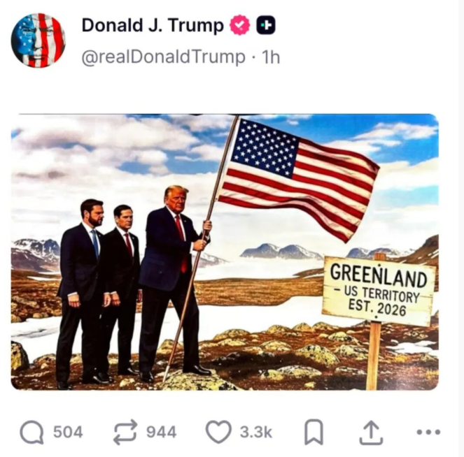 手持星条旗登上格陵兰岛,身后站着万斯和鲁比奥,旁边指示牌还有一行字:“格陵兰岛2026年成为美国领土”。