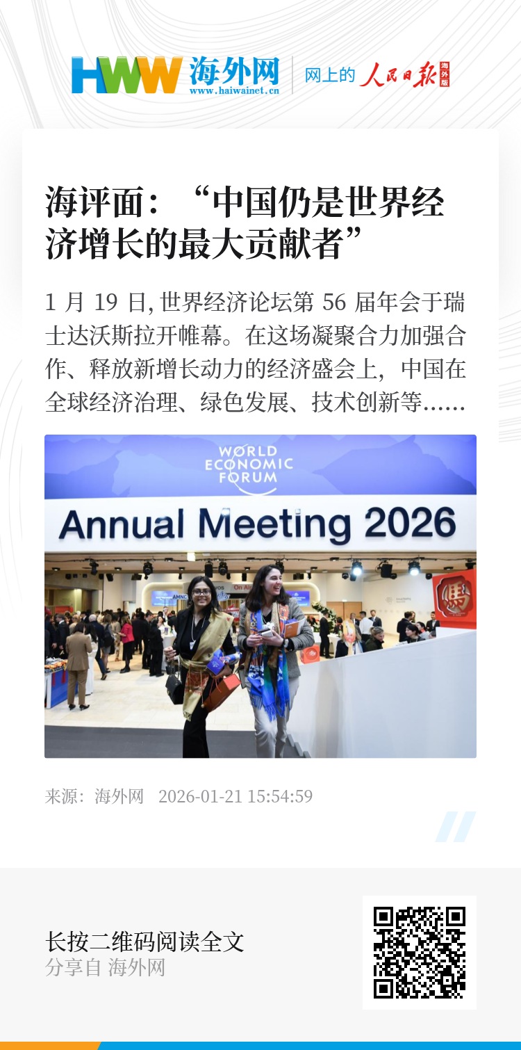 1 月 19 日,世界经济论坛第 56 届年会于瑞士达沃斯拉开帷幕。在这场凝聚合力加强合作、释放新增长动力的经济盛会上,中国在全球经济治理、绿色发展、技术创新等领域的全球贡献备受瞩目。世界经济论坛总裁兼首席执行官博尔格·布伦德在接受采访时盛赞道,“中国在传统优势领域持续发力,同时积极进军新兴技术领域。中国仍是全球经济增长的最大贡献者。”