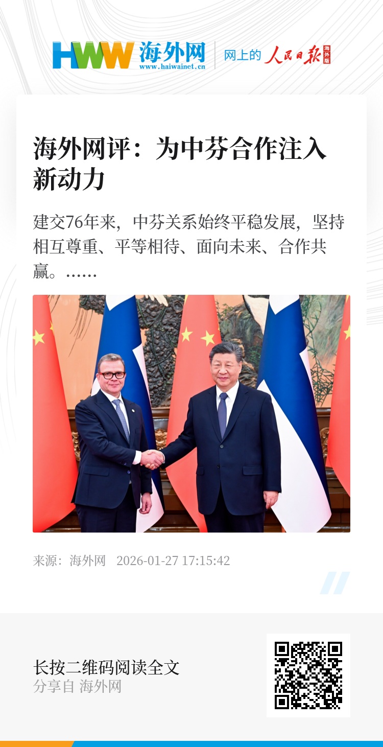 建交76年来,中芬关系始终平稳发展,坚持相互尊重、平等相待、面向未来、合作共赢。展望未来,中方愿同芬方增进互信、加强交流、深化合作,助力各自国家发展,为两国人民带来更多福祉。(海外网评论员)