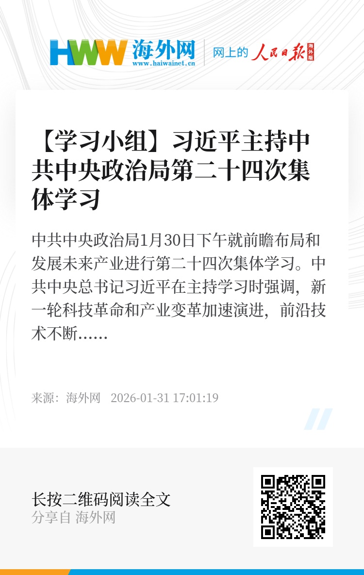 中共中央政治局1月30日下午就前瞻布局和发展未来产业进行第二十四次集体学习。中共中央总书记习近平在主持学习时强调,新一轮科技革命和产业变革加速演进,前沿技术不断涌现,引领和支撑未来产业快速崛起。要站在推进强国建设、民族复兴伟业的战略高度,立足客观条件,发挥比较优势,坚持稳中求进、梯度培育,推动我国未来产业发展不断取得新突破。
