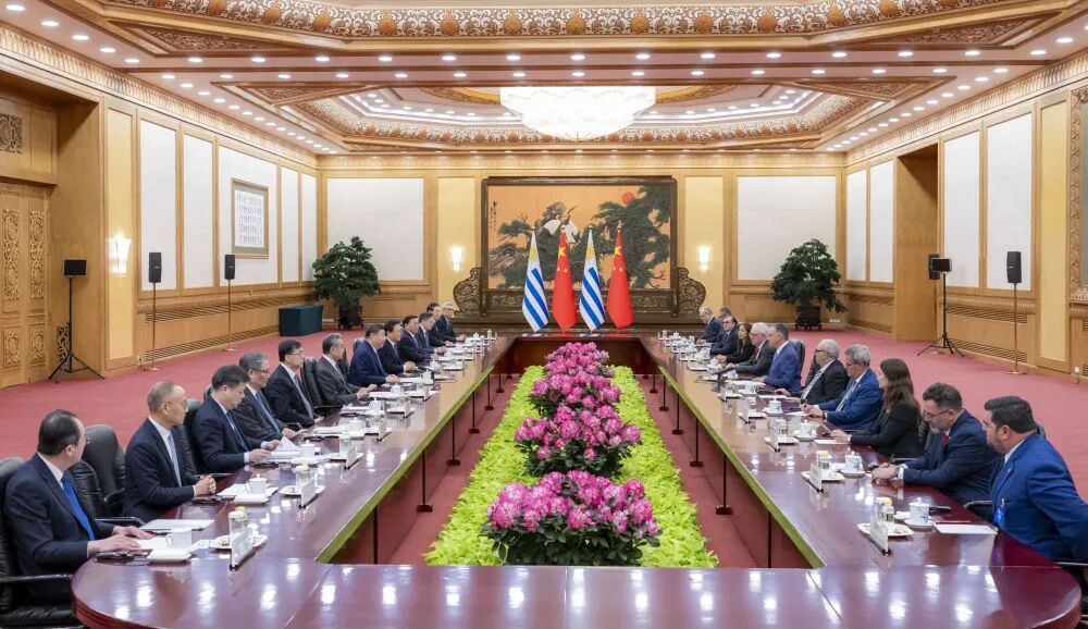 习近平指出,当今世界正处于百年未有之大变局,国际形势变乱交织,单边霸凌愈演愈烈,中方支持乌拉圭接任“77国集团和中国”轮值主席国,愿与乌方加强全球南方团结协作,共同推进平等有序的世界多极化、普惠包容的经济全球化,携手并进、共谋发展,为构建人类命运共同体作出更大贡献。中方始终重视中拉关系,支持拉美和加勒比国家维护自身主权、安全、发展利益,支持乌拉圭接任拉美和加勒比国家共同体以及南方共同市场轮值主席国,愿同乌方和地区国家推动共建中拉命运共同体走深走实。