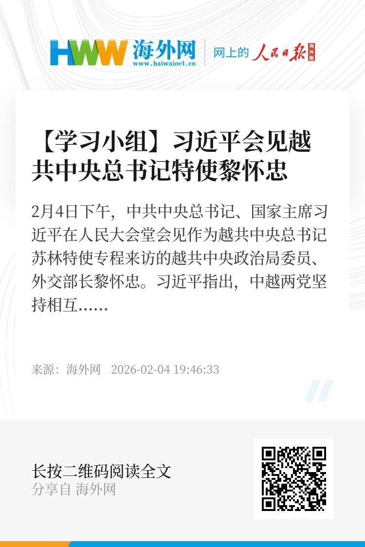 2月4日下午,中共中央总书记、国家主席习近平在人民大会堂会见作为越共中央总书记苏林特使专程来访的越共中央政治局委员、外交部长黎怀忠。