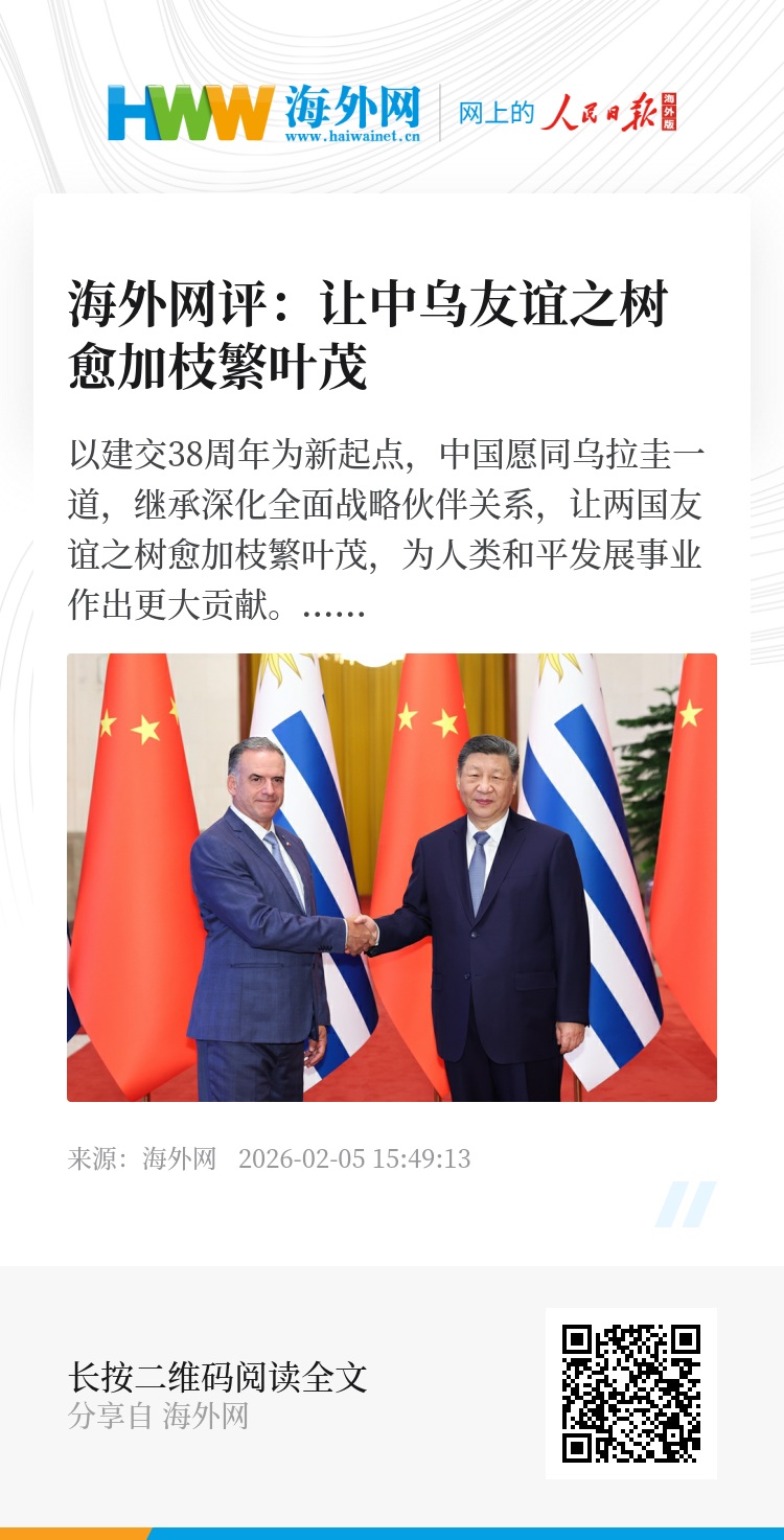 中国和乌拉圭合作潜力巨大、前景广阔。以建交38周年为新起点,中国愿同乌拉圭一道,继承深化全面战略伙伴关系,让两国友谊之树愈加枝繁叶茂,为人类和平发展事业作出更大贡献。(海外网评论员)
