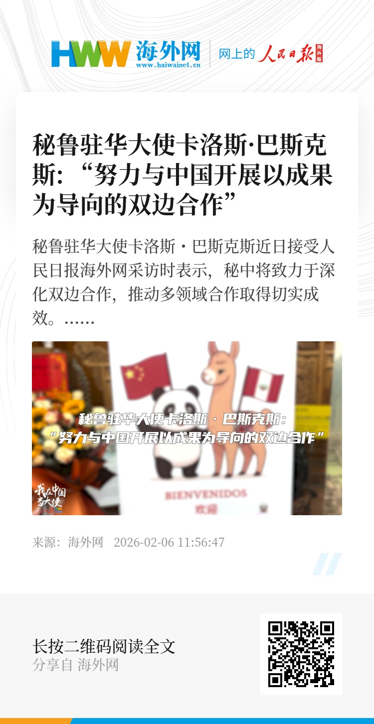 秘鲁驻华大使卡洛斯・巴斯克斯近日接受人民日报海外网采访时表示,秘中将致力于深化双边合作,推动多领域合作取得切实成效。“我们正努力制定一个非常务实的合作范围,并与中国开展以结果为导向的双边合作。”巴斯克斯说。