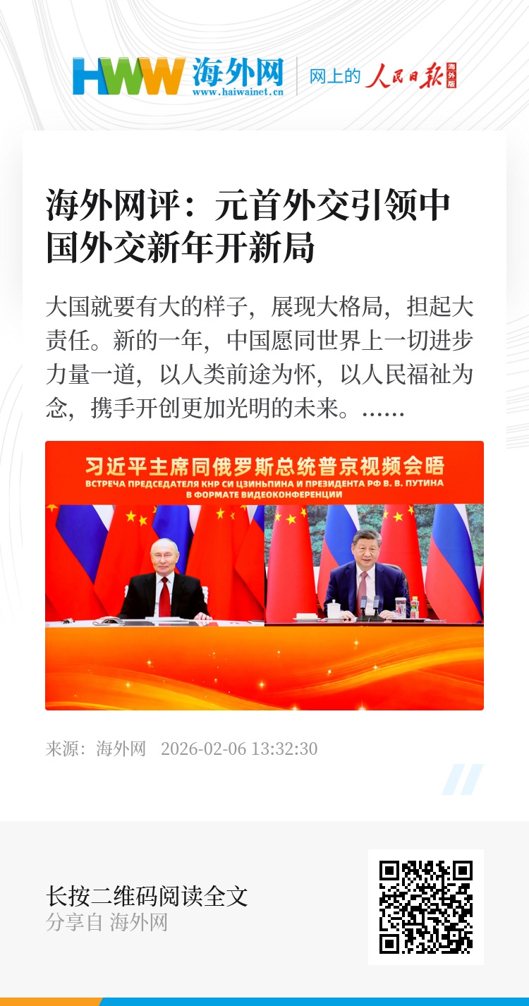 元首外交是中国外交的最高形式,在中国特色大国外交中发挥着决定性作用。过去一年,中俄元首两度会晤,引领中俄关系步入新的发展阶段:两国元首共同出席对方国家举办的世界反法西斯战争胜利80周年纪念活动,展示了两国捍卫二战胜利成果和国际公平正义的坚定决心;两国元首举行深入友好、富有成果的会谈,签署关于进一步深化中俄新时代全面战略协作伙伴关系的联合声明,为双边关系发展擘画了清晰的战略蓝图。今年是中俄战略协作伙伴关系建立30周年、《中俄睦邻友好合作条约》签署25周年,中俄关系发展迎来新的历史机遇。展望新的一年,普京总统表示“对俄中关系充满信心”。过去一年,中美元首保持良好沟通,在釜山成功会晤,为中美关系领航把舵,受到两国人民和国际社会欢迎。只要中美双方遵循两国元首达成的重要共识,一件事一件事去做,不断积累互信,就可以走出一条正确相处之道,让2026年成为中美两个大国迈向相互尊重、和平共处、合作共赢的一年。这是两国人民所愿,也是国际社会所盼。