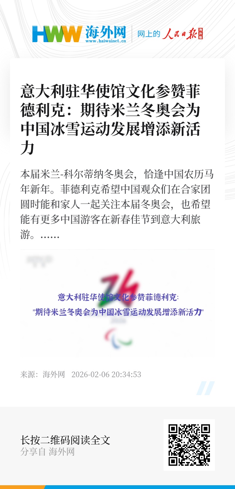 回忆起四年前的2022年北京冬奥会,菲德利克表示,北京冬奥会的顺利举办让冰雪运动在中国从小众运动变为一种人们喜欢的生活方式,中国冰雪经济体量也在迅速扩大,北京冬奥会时“三亿人上冰雪”的呼吁已成为现实。“我对北京奥运会和冬奥会都印象十分深刻,我去过北京冬奥会的比赛场地,平时也会和家人们一起去滑雪。意大利驻华使馆文化处也是北京冬残奥会时的‘意大利之家’,所以我们对北京冬奥会的回忆很美好。”菲德利克补充道,“每届冬奥会都对冰雪运动的发展起到推动作用,希望本届冬奥会也能为中国冰雪运动发展增添新活力。”