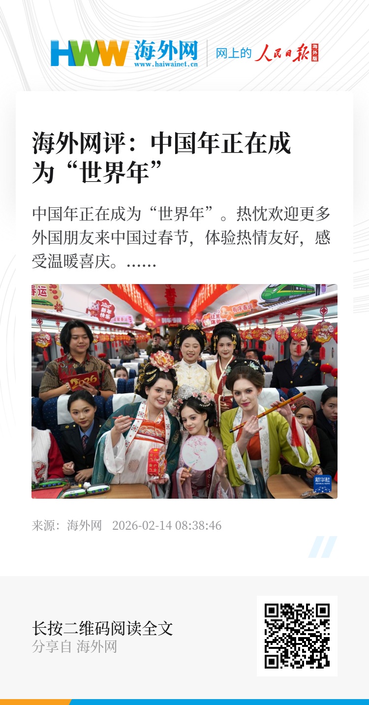 中国年正在成为“世界年”。热忱欢迎更多外国朋友来中国过春节,体验热情友好,感受温暖喜庆。一个可信、可爱、可敬的中国,终会走进全世界更多人心中。(海外网评论员)