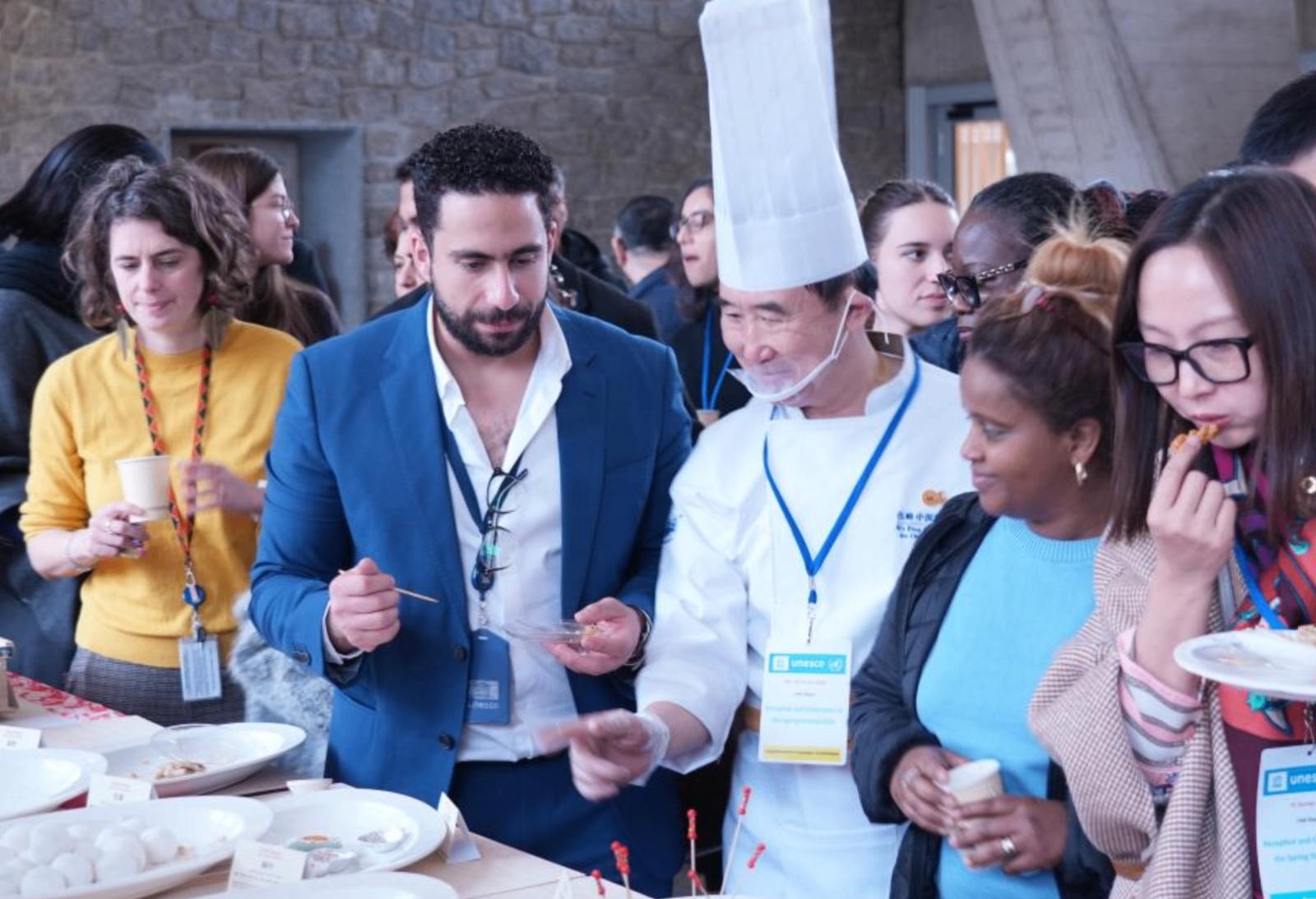 2月10日,在位于法国巴黎的联合国教科文组织总部,中外来宾在春节庙会活动现场品尝中国传统美食。(图片来源:新华社)