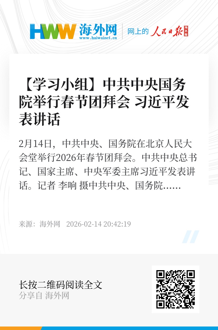 中共中央、国务院14日上午在人民大会堂举行2026年春节团拜会。中共中央总书记、国家主席、中央军委主席习近平发表讲话,代表党中央和国务院,向全国各族人民,向香港特别行政区同胞、澳门特别行政区同胞、台湾同胞和海外侨胞拜年。
