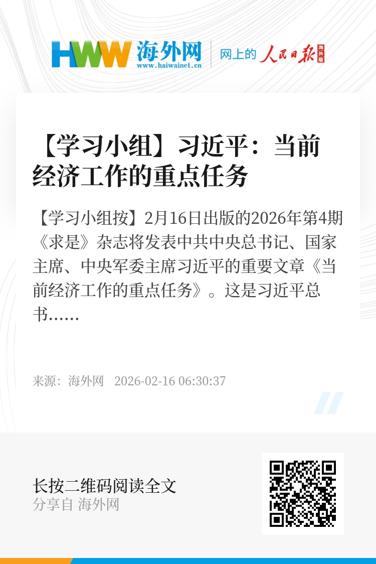 2月16日出版的2026年第4期《求是》杂志将发表中共中央总书记、国家主席、中央军委主席习近平的重要文章《当前经济工作的重点任务》。这是习近平总书记2025年12月10日在中央经济工作会议上讲话的一部分。