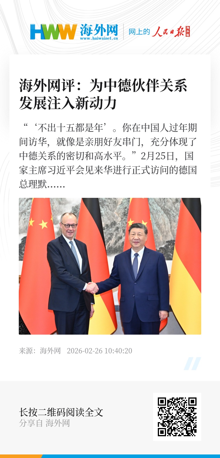 “‘不出十五都是年’。你在中国人过年期间访华,就像是亲朋好友串门,充分体现了中德关系的密切和高水平。”2月25日,国家主席习近平会见来华进行正式访问的德国总理默茨。这是默茨就任总理后首次访华,他成为马年伊始中国接待的首位外国政府首脑,也是2026年第4位访华的欧洲国家领导人,受到国际社会高度关注。访问期间,中德签署多个领域的合作文件,并发表联合新闻声明,双方互利合作更加紧密。