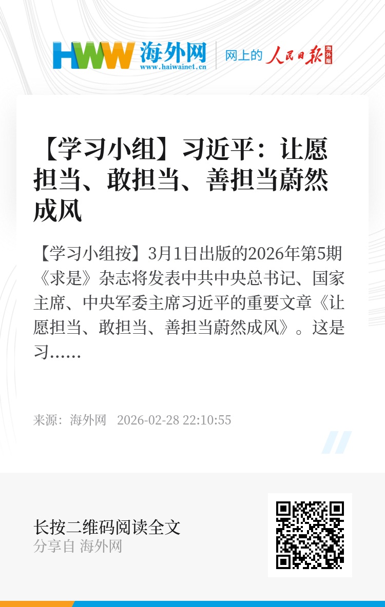 3月1日出版的2026年第5期《求是》杂志将发表中共中央总书记、国家主席、中央军委主席习近平的重要文章《让愿担当、敢担当、善担当蔚然成风》。这是习近平总书记2012年12月至2025年12月期间有关重要论述的节录。