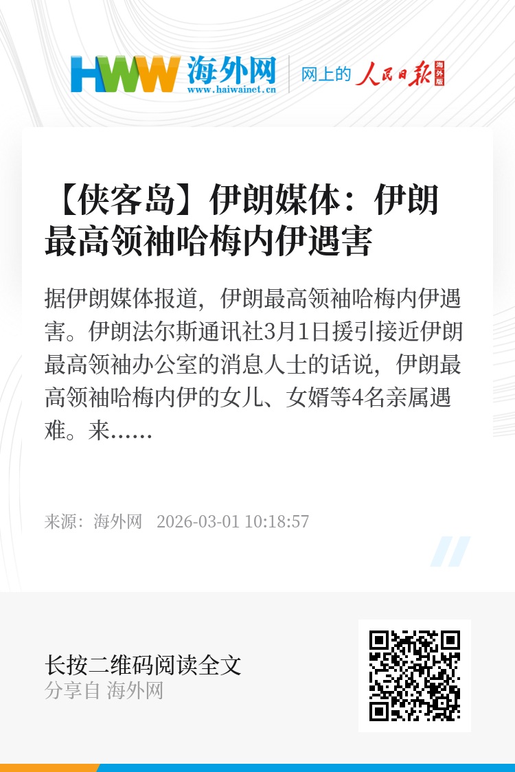 伊朗法尔斯通讯社3月1日援引接近伊朗最高领袖办公室的消息人士的话说,伊朗最高领袖哈梅内伊的女儿、女婿等4名亲属遇难。