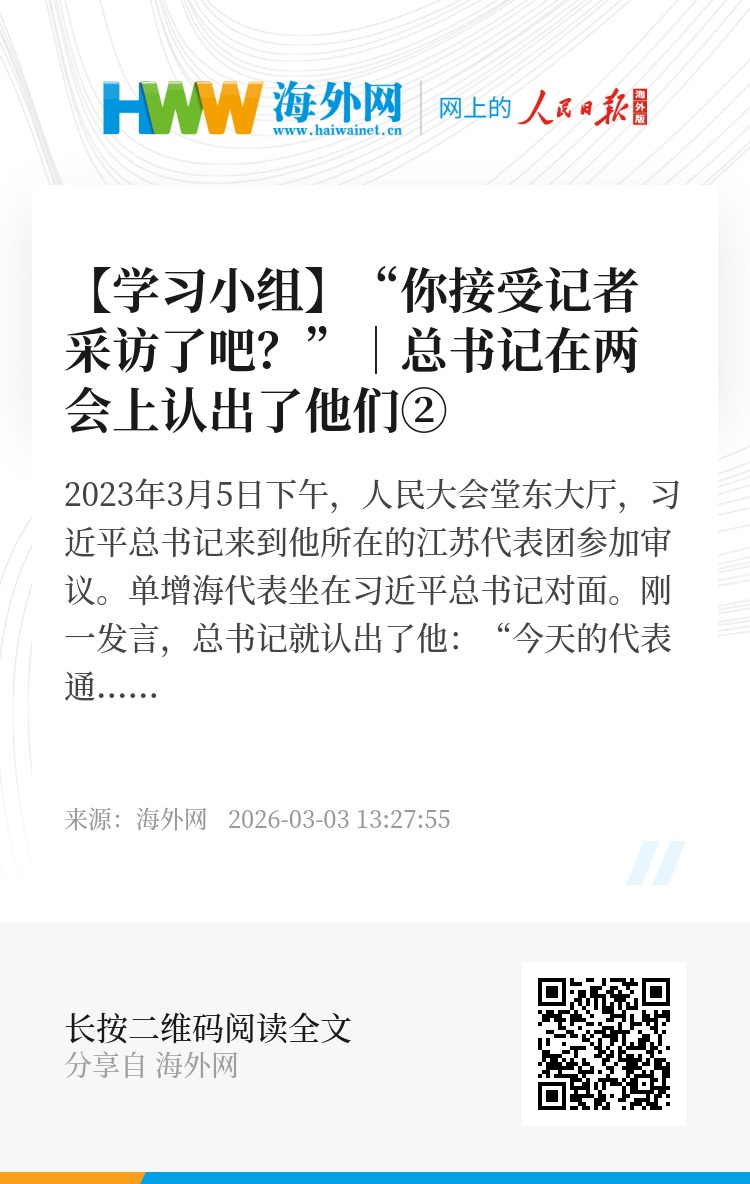单增海代表坐在习近平总书记对面。刚一发言,总书记就认出了他:“今天的代表通道,你接受记者采访了吧?”