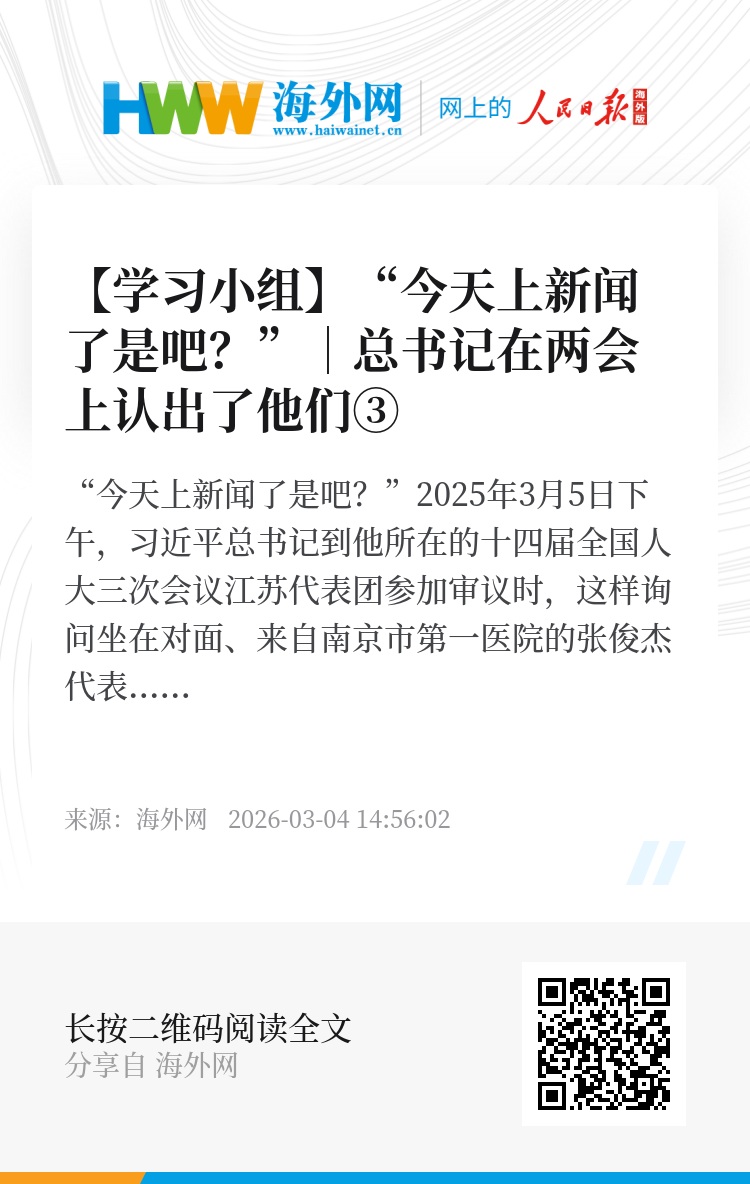 “今天上新闻了是吧?”2025年3月5日下午,习近平总书记到他所在的十四届全国人大三次会议江苏代表团参加审议时,这样询问坐在对面、来自南京市第一医院的张俊杰代表。