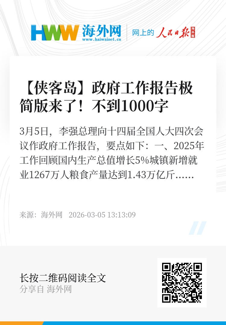 3月5日,李强总理向十四届全国人大四次会议作政府工作报告,要点如下: