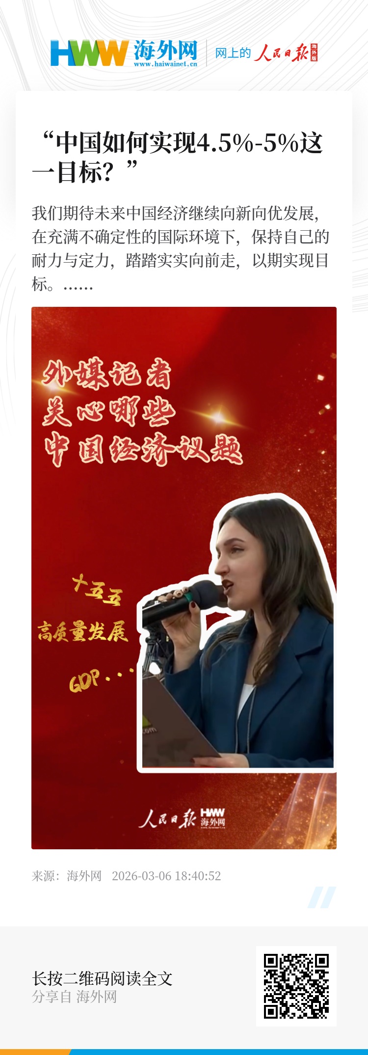 十四届全国人大四次会议经济主题记者会于3月6日在北京梅地亚中心召开。2026年中国经济发展方向在世界范围内吸引了广泛关注,多名外媒记者在会上向提问。我们期待未来中国经济继续向新向优发展,在充满不确定性的国际环境下,保持自己的耐力与定力,踏踏实实向前走,以期实现目标。