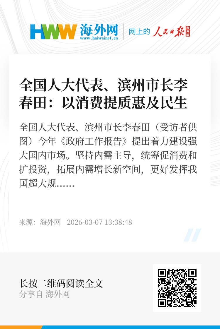 “今年《政府工作报告》提出,坚持内需主导、建设强大国内市场,实施提振消费专项行动、完善扩大内需战略,我们要关于提高居民收入、丰富消费供给、优化消费环境,激发居民消费内生动力,推动消费持续增长,以消费提质惠及民生、以内需激活推动发展。”全国人大代表、滨州市长李春田表示。2026年,滨州将进一步抓实消费提振,发挥好消费对滨州高质量发展的基础性支撑作用。实施城乡居民增收计划,开展提振消费专项行动,纵深推进消费品以旧换新,举办促消费活动,培育市级夜经济示范街区、推进国家级“一刻钟便民生活圈”试点,推出更多消费“打卡地”。扩容新型消费,发展直播电商、即时零售、人工智能等新业态,开展“直播+”商圈、景点、展会等促消费活动。推动连锁商业向乡村下沉,持续推进“数商兴农”,实现消费升级和农民增收的“双向奔赴”。(海外网 牛宁)