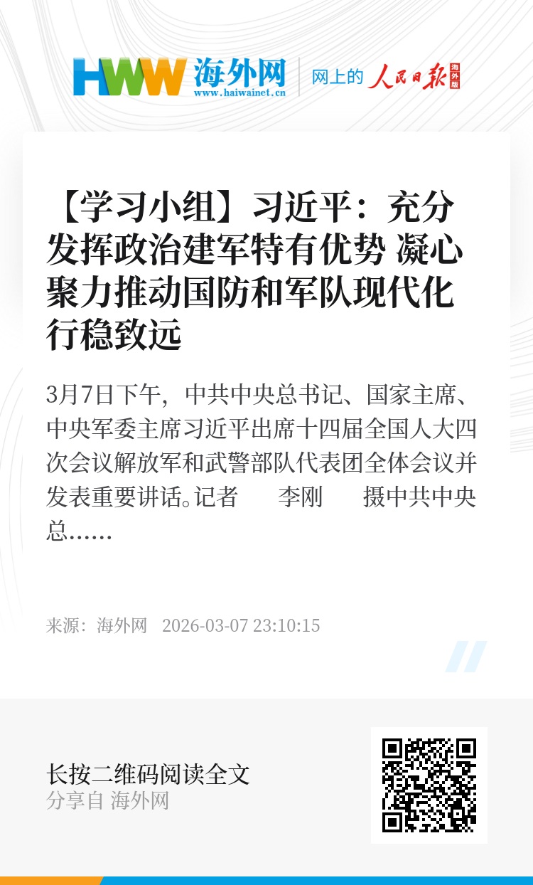 中共中央总书记、国家主席、中央军委主席习近平7日下午在出席十四届全国人大四次会议解放军和武警部队代表团全体会议时强调,“十五五”时期要如期实现建军一百年奋斗目标、高质量推进国防和军队现代化,必须坚持好、运用好、发展好政治建军这个重要法宝,毫不动摇坚持和加强党对军队绝对领导,充分发挥政治建军特有优势,凝心聚力推动国防和军队现代化行稳致远。