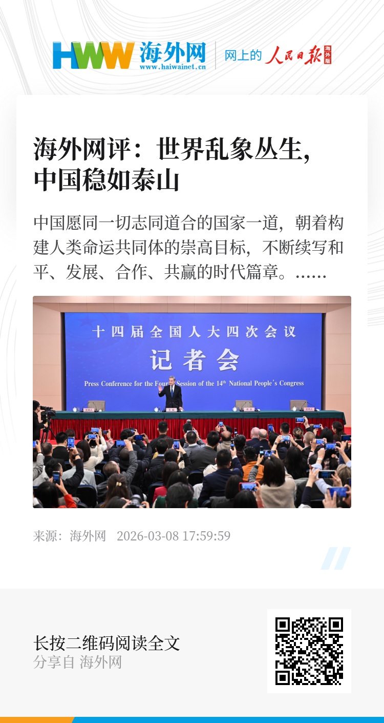 “我想告诉海外的同胞们,你面前的世界乱象丛生,你身后的祖国稳如泰山”“中国绝不走国强必霸的老路,也不认同‘大国共治’的逻辑”……十四届全国人大四次会议3月8日上午举行外交主题记者会,中共中央政治局委员、外交部长王毅回答中外记者提问。中国愿同一切志同道合的国家一道,朝着构建人类命运共同体的崇高目标,不断续写和平、发展、合作、共赢的时代篇章。