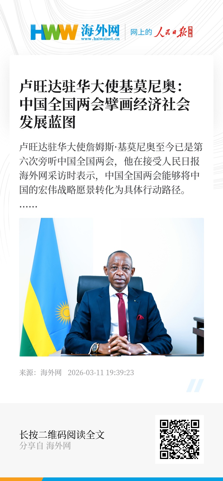 卢旺达驻华大使詹姆斯·基莫尼奥至今已是第六次旁听中国全国两会,他在接受人民日报海外网采访时表示,中国全国两会能够将中国的宏伟战略愿景转化为具体行动路径。它不仅为经济运行提供政策预期,为市场主体注入信心,也为各地各部门发展及行业发展明确方向。可以说,中国全国两会是实实在在擘画中国经济社会发展蓝图、引领国家前进方向的治理实践。