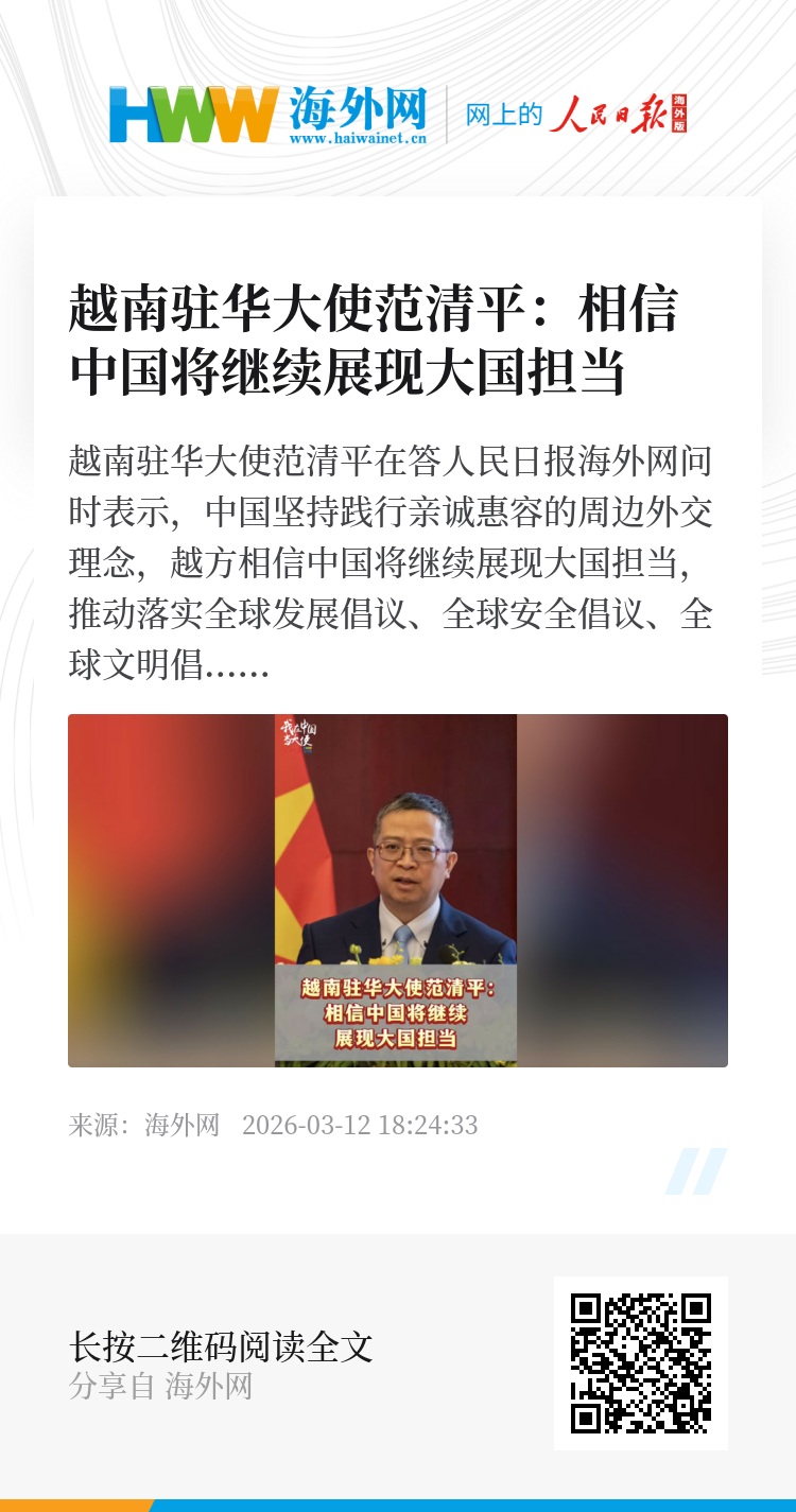 越南驻华大使馆12日举办2026年越中媒体见面会。越南驻华大使范清平在答人民日报海外网问时表示,中国坚持践行亲诚惠容的周边外交理念,越方相信中国将继续展现大国担当,推动落实全球发展倡议、全球安全倡议、全球文明倡议、全球治理倡议,推进高质量共建“一带一路”。