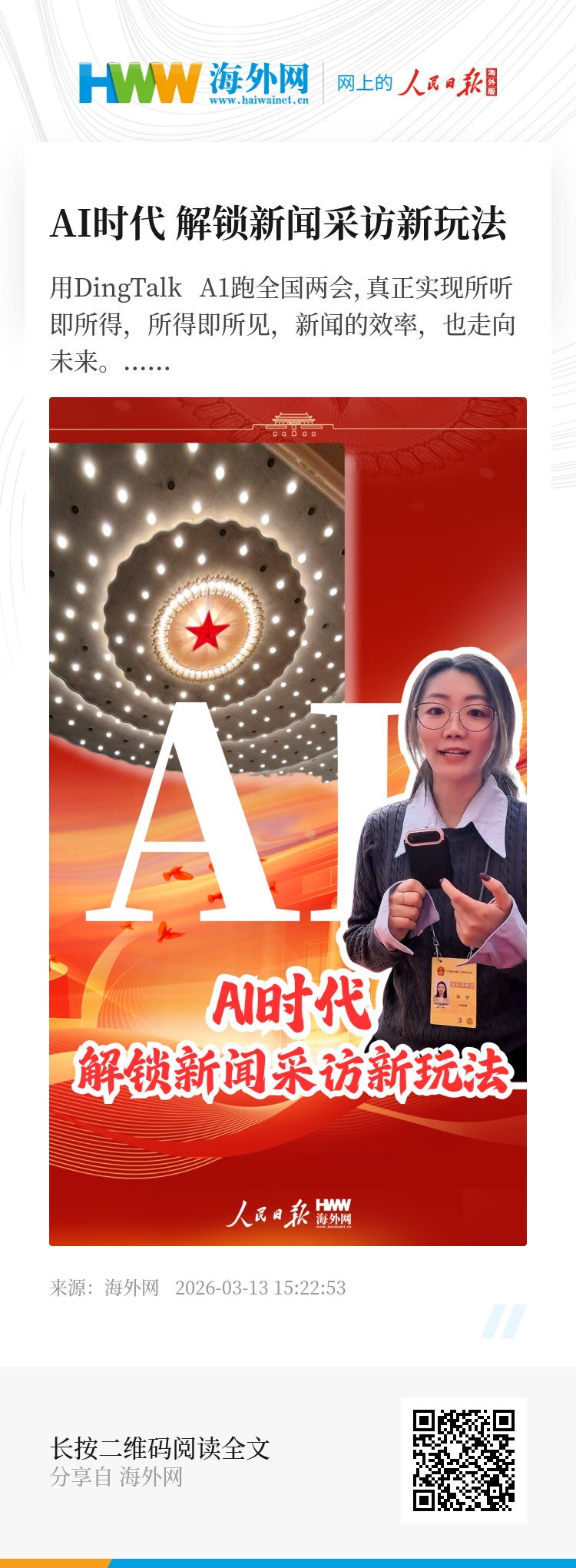 两会现场有多少声音?数千人讲话的嘈杂声、脚步声、快门声……而借助如今的AI新科技,将DingTalk A1贴在手机上,代表委员站在面前接受采访,如入无人之境。并且,过去用手机录音,难以兼顾拍摄;若是准备录音笔,手上设备又太多。这次用DingTalk A1,兼顾敏捷与实用,一个个“金句”就这样记录下来。用DingTalk A1跑全国两会,真正实现所听即所得,所得即所见,新闻的效率,也走向未来。(海外网 牛宁)