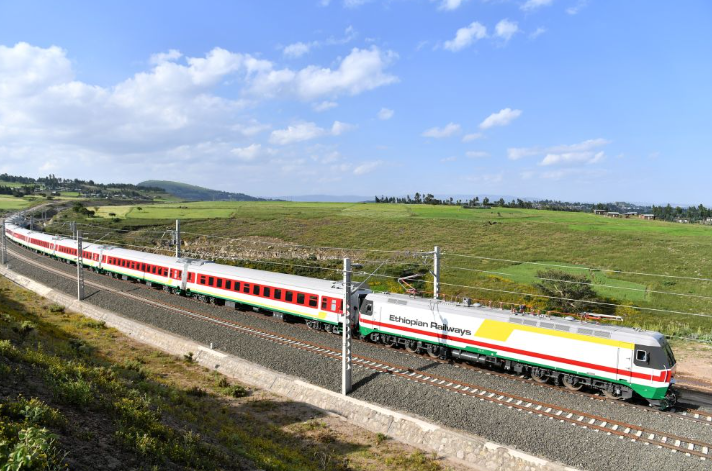 在埃塞俄比亚首都亚的斯亚贝巴附近,列车在亚吉铁路上行驶。(图源:新华社)