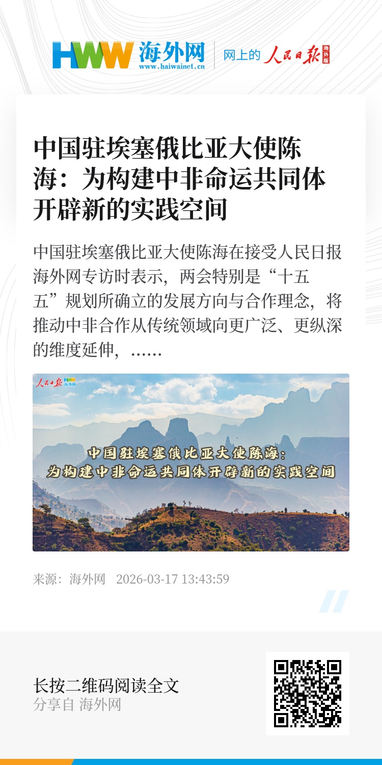 不久前,2026年全国两会胜利闭幕,今年两会最受关注的就是表决通过了“十五五”规划纲要。“十五五”规划不仅是推动中国式现代化建设的“施工图”,也是与各国推进共同现代化的“邀请函”。近年来,中国与埃塞俄比亚经贸往来密切,中国连续多年保持埃塞第一大贸易伙伴、第一大外商直接投资来源国、第一大工程建设参与者地位。针对“十五五”开局之年中埃塞两国的发展合作,中国驻埃塞俄比亚大使陈海日前接受人民日报海外网专访时表示,两会特别是“十五五”规划所确立的发展方向与合作理念,将推动中非合作从传统领域向更广泛、更纵深的维度延伸,为构建中非命运共同体开辟新的实践空间。