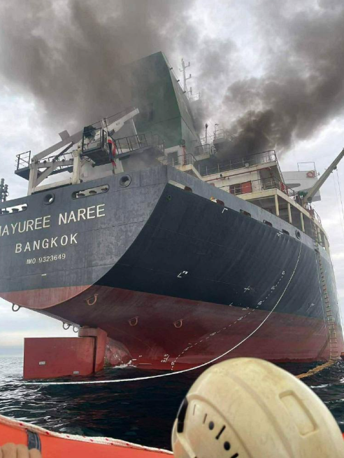 这张泰国海军3月11日发布的照片显示,一艘泰国货船在霍尔木兹海峡海域遭袭起火。图源:新华社