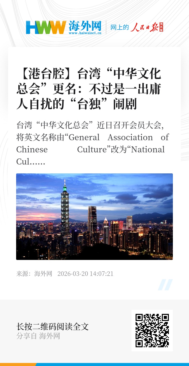 台湾文化始终是中华文化的重要分支,不是什么异族文化。台湾同胞的思想观念、价值判断以及岛内的饮食、民俗、语言、艺术等方方面面,无不深深烙刻着中华文化的印记,从春节团圆、中秋赏月到汉字书写、儒家思想,中华文化像氧气一样融入台湾各界民众日常生活。更改一个机构的名称,根本无法割裂这份深入骨髓的文化联结。岛内有识之士直言,这种操作是在推动所谓“小岛文化诉求”,只会限缩台湾文化传承的厚度与广度,完全违背文化发展的客观规律。