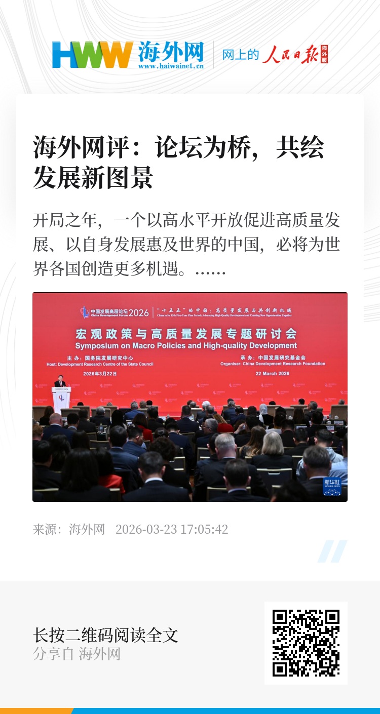 “全球跨国公司负责人齐聚北京,中国对扩大开放表现出信心”“中国总理告诉70多位全球顶级高管,中国拥有无可比拟的供应链和可预测的商业环境”……3月22日至23日在北京举行的中国发展高层论坛2026年年会,连日来受到《韩国经济》、英国《金融时报》等外媒的广泛关注。今年论坛年会的主题是“‘十五五’的中国:高质量发展与共创新机遇”,包括新开发银行行长罗塞芙、亚洲基础设施投资银行行长邹加怡,以及国内外工商界代表等约750人参加了22日的开幕式。作为全国两会后首个国家级大型国际论坛,本届论坛向世界释放出中国将坚定推进高水平开放、推动高质量发展的重要信号。