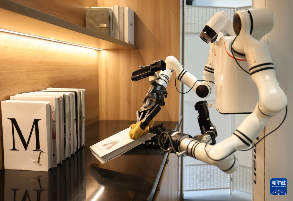 3月25日,在北京市石景山区首钢园内的人形机器人数据训练中心,一款机器人在模拟“家居生活”场景中工作。 新华社记者 张晨霖/摄