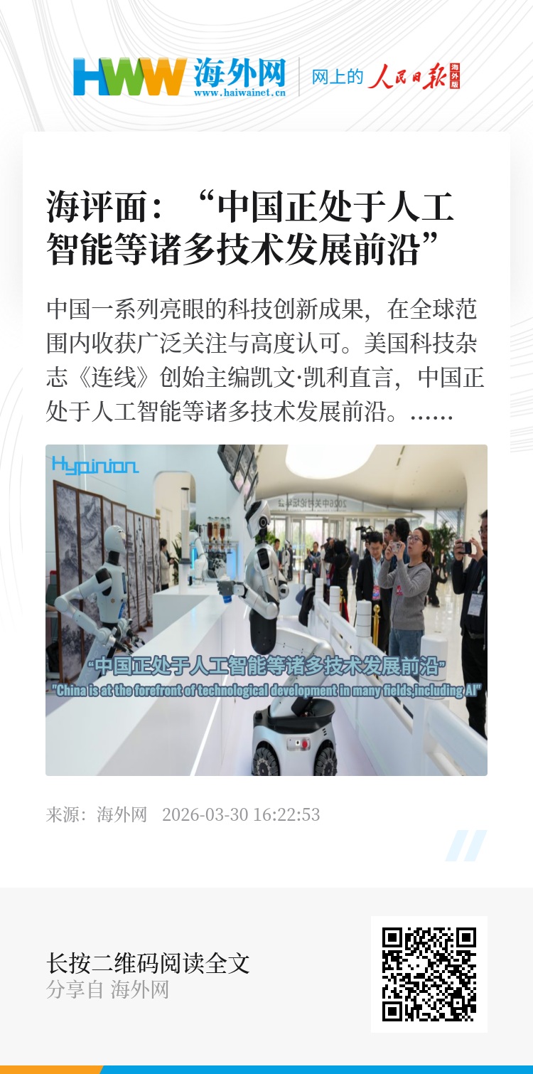 “中国力争成为人工智能领域的全球领导者。”美国有线电视新闻网(CNN)3月30日撰文如是说,“中国科技热潮或成为AI行业的‘游戏规则改变者’。”德国慕尼黑大学和咨询公司MHP近日联合发布的《2026工业4.0晴雨表》报告显示,中国工业数字化水平已跻身全球领先地位,在数字孪生技术、人工智能、供应链透明度和自动化等方面表现突出。3月29日,中国科学技术发展战略研究院发布的《国家创新指数报告2025》显示,中国国家创新指数综合排名上升至世界第9位,较上年提升1位。若将视野拉长便会发现,相较于2012年,中国的综合排名已大幅提升11位,成为近十余年来全球创新指数进步最快的国家。新西兰前总理珍妮·希普利认为,“中国多年来一直致力于5G、6G等智能技术的研发,并已做好充分准备,将这些创新成果应用于家庭和社区。智能人形机器人在工业领域的应用将符合中国的利益,并有助于中国更快地发展。”