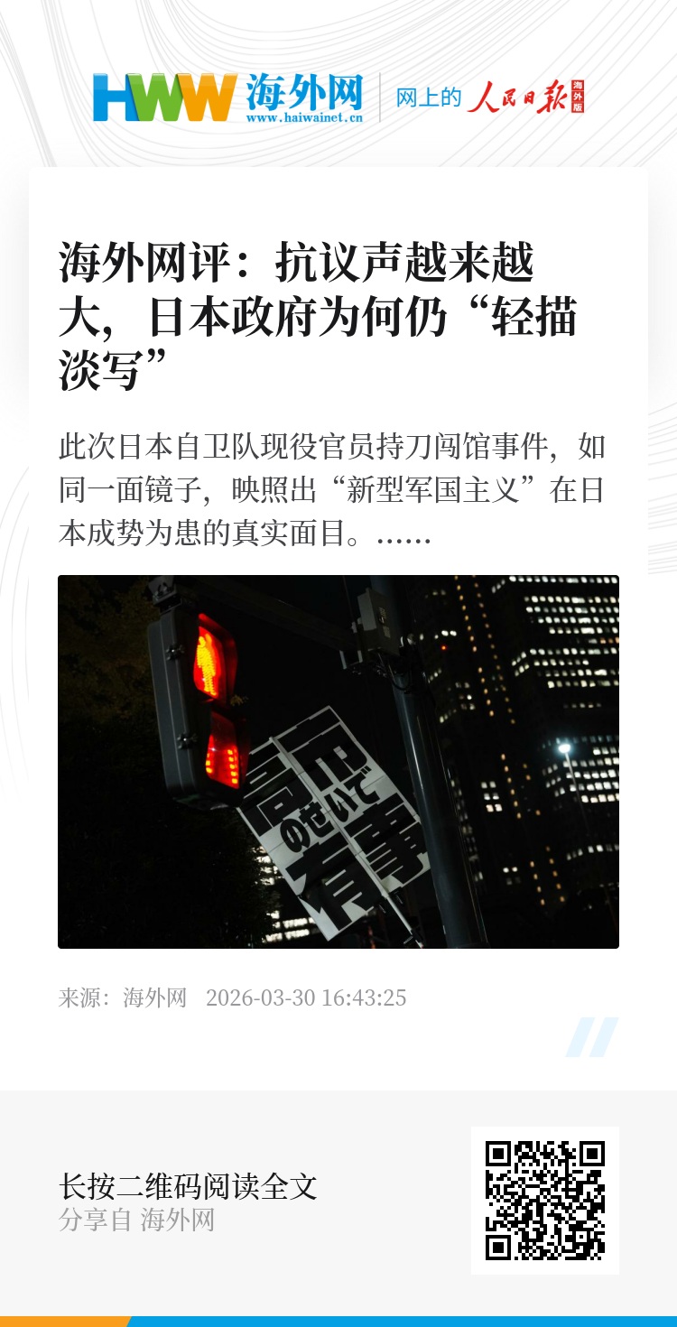 此次日本自卫队现役官员持刀闯馆事件,如同一面镜子,映照出“新型军国主义”在日本成势为患的真实面目。国际社会必须以此为戒,保持高度清醒:对日本的任何军事冒险苗头,都应及时亮剑。唯有日本真正直面侵略历史,地区和平才有坚实基础。否则,历史的幽灵不会悄然散去,它正以“新型”面目,悄然逼近下一个危险拐点。(海外网评论员)