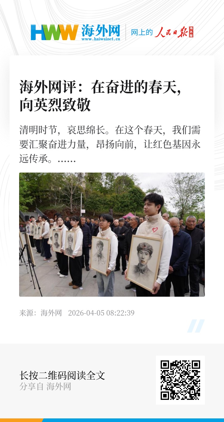 清明时节,哀思绵长。在这个春天,我们需要汇聚奋进力量,昂扬向前,让红色基因永远传承。(海外网评论员)