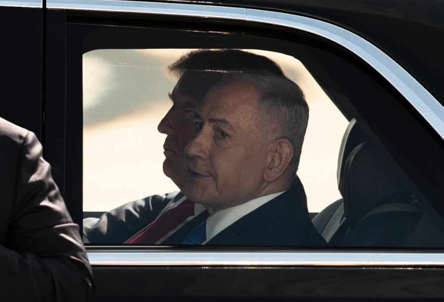 2025年10月13日,在以色列本-古里安机场,以色列总理内塔尼亚胡(前)同到访的美国总统特朗普同乘一辆车。图源:新华社