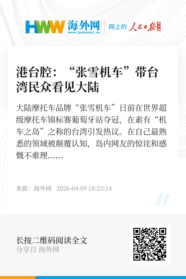许多台湾网友表示,大陆品牌在国际赛场争气,“大长两岸中国人的志气”。而张雪从一名普通修车学徒到冒雨骑行百公里追梦,再到创立品牌并在国际赛场夺冠,现实版的“飞驰人生”、草根逆袭的奋斗故事也跨越了海峡,打动了包括台湾摩托车爱好者在内的许多人。大陆的成就也是台湾的荣耀,大陆的进步更是台湾的福祉。两岸中国人血脉相连、情感相通,彼此走近走亲、相知相惜、携手发展,本是最理所当然的事。(王平)