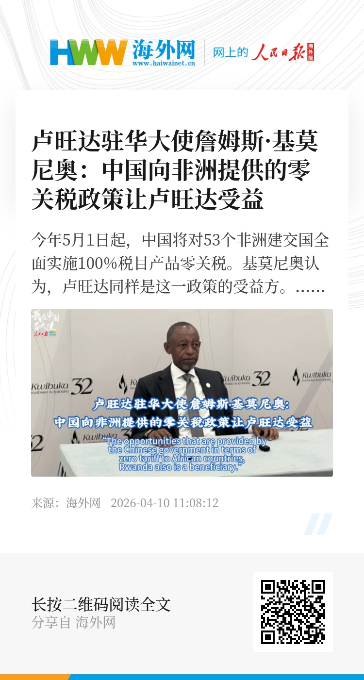 今年是卢旺达大屠杀32周年,卢旺达驻华大使馆在京举办纪念活动。卢旺达驻华大使詹姆斯·基莫尼奥在答人民日报海外网问时表示,缅怀历史的同时更要着眼未来,思考如何携手共建未来。今年5月1日起,中国将对53个非洲建交国全面实施100%税目产品零关税。基莫尼奥认为,卢旺达同样是这一政策的受益方。