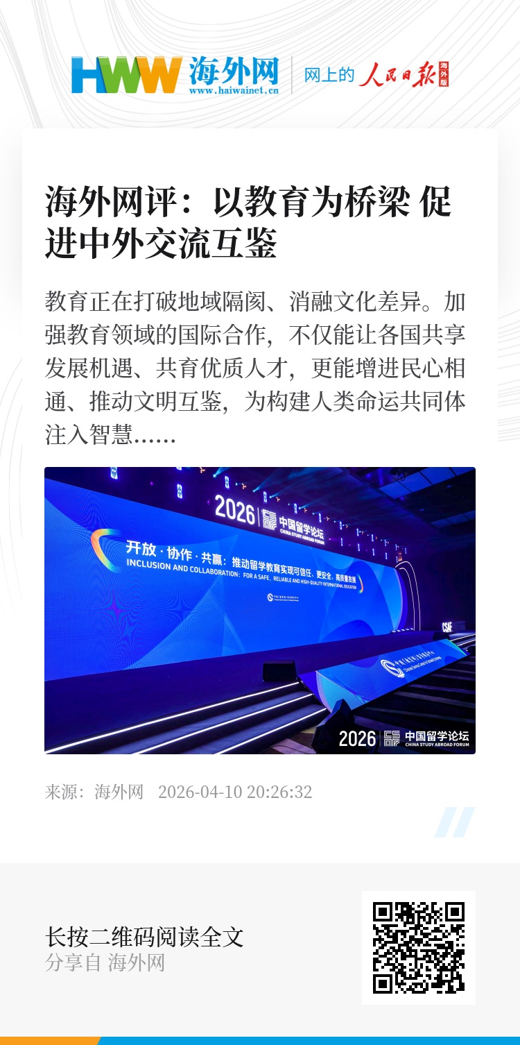 “2025年,中国出国留学人数超57万,留学回国人数达53.56万”“中国吸引190多个国家和地区的留学生来华求学”……4月10日,2026中国留学论坛暨中国国际教育巡回展开幕式在北京举行,上述数据一经公布,便引发广泛关注。数据背后,折射出中国经济和教育事业的高质量发展,彰显了中外人才双向奔赴、交流互鉴的蓬勃生机。