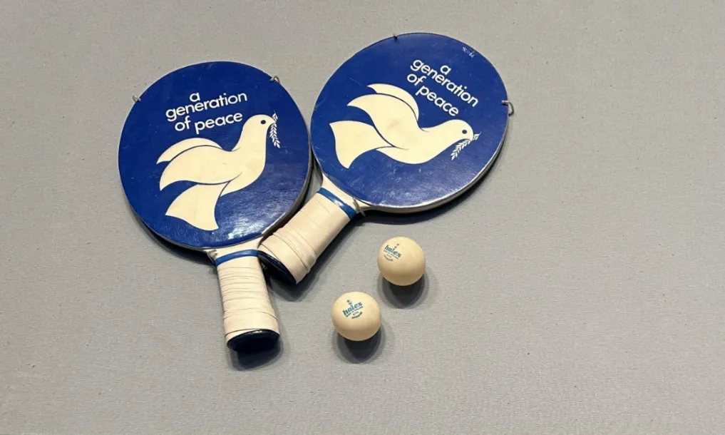 中央礼品文物管理中心收藏着一副乒乓球拍,是当年“乒乓外交”的直接见证。蓝白相间的拍面上,白色和平鸽衔着橄榄枝展翅飞翔,上方写有英文“a generation of peace”,意为“和平的一代”。